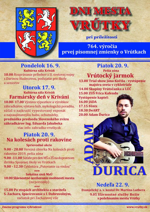 Mesto Vrútky Vás pozýva na DNI MESTA, ktorých súčasťou bude aj Vrútocký jarmok dňa 20.9.2019 a tiež rôzne sprievodné podujatia.