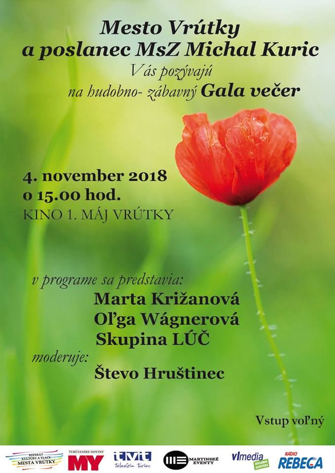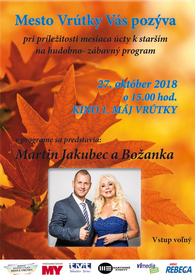 8. Október, 2018 | pridal adminMesto Vrútky Vás pozýva na jesenné koncerty pri príležitosti mesiaca úcty k starším: hudobno-zábavný program, kde vystúpia Martin Jakubec s Božankou a ďalším koncertom je hudobno-zábavný Gala večer s Martou Križanovou, Oľgou Wágnerovou a skupinou LÚČ, ktorý bude moderovať Števo Hruštinec.