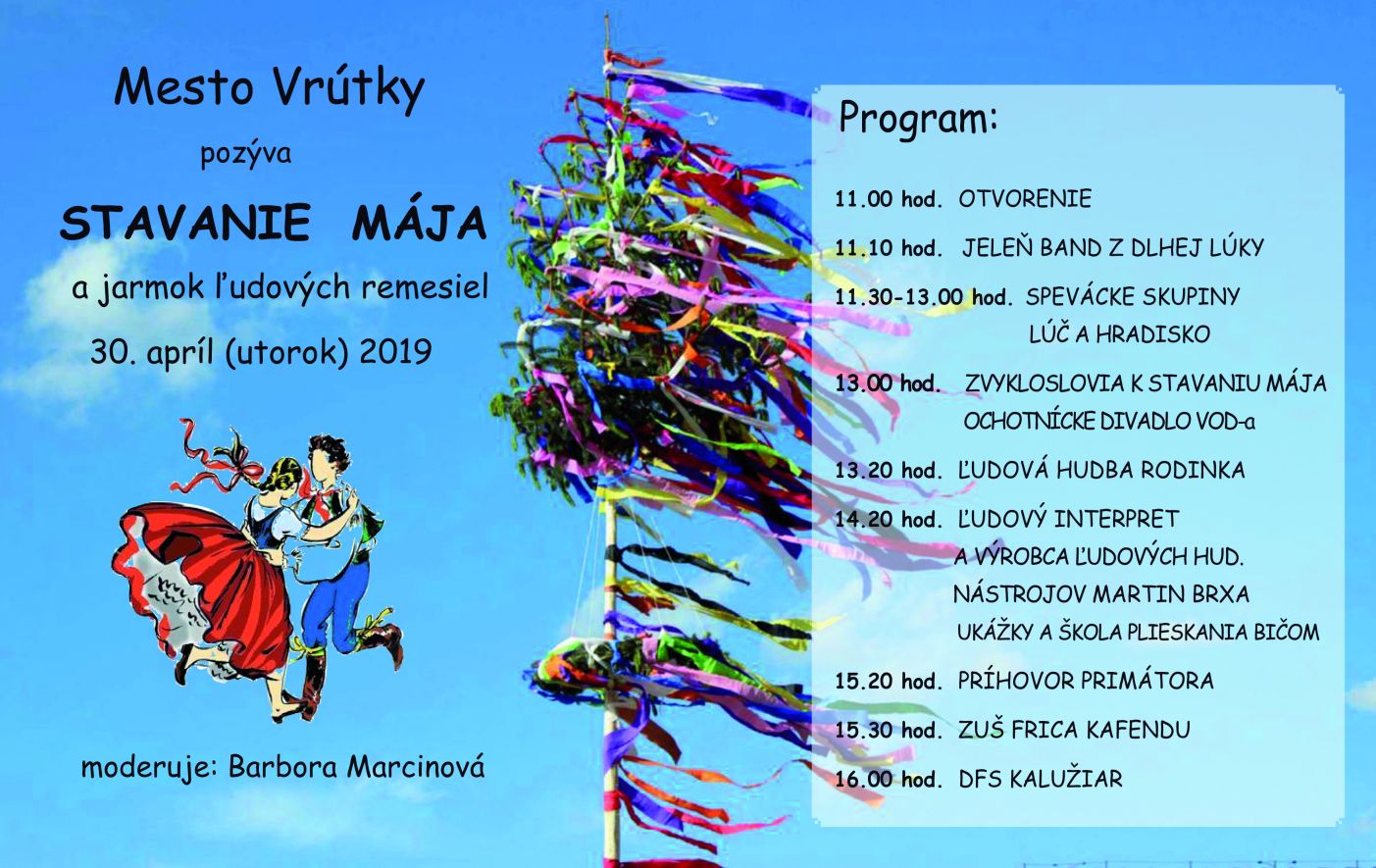 Mesto Vrútky Vás pozýva na STAVANIE MÁJA spojené s predajnými trhmi, prezentáciou ľudových remesiel a kultúrnym programom v utorok 30. apríla 2019 od 11.00 hod. na pešej zóne vo Vrútkach.