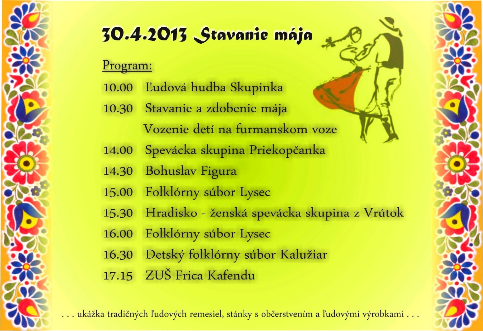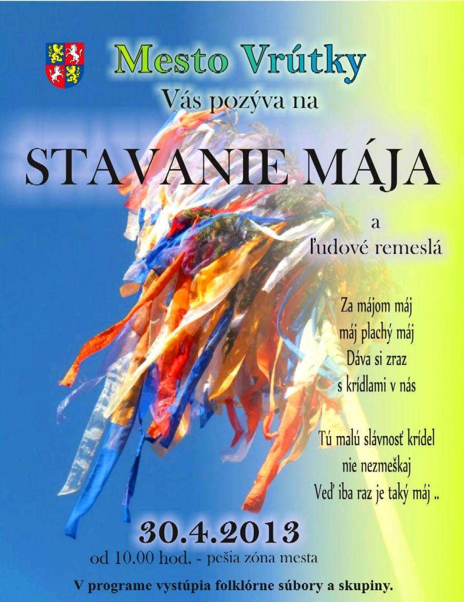 Mesto Vrútky Vás pozýva na STAVANIE MÁJA spojené s predajnými trhmi, prezentáciou ľudových remesiel a kultúrnym programom v utorok 30. apríla 2013 od 10.00 hod. na pešej zóne vo Vrútkach.
