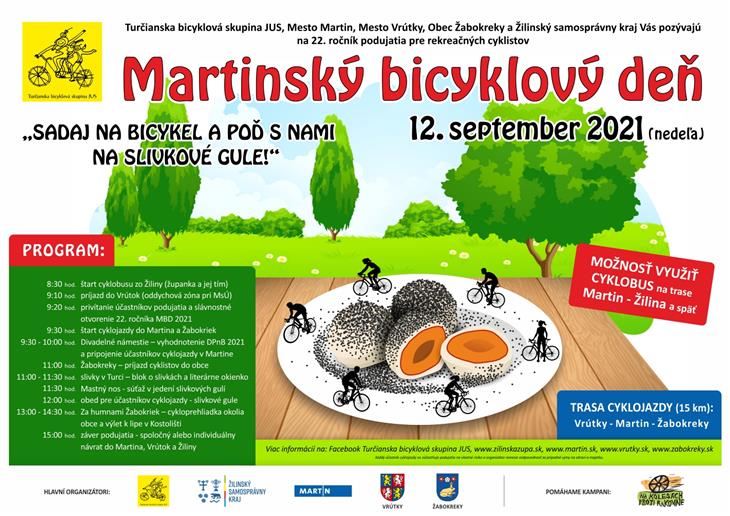 Mesto Vrútky si Vás dovoľuje pozvať na 22. ročník cyklopodujatia Martinský bicyklový deň s témou: "Sadaj na bicykel a poď nami na slivkové gule!", ktorý sa uskutoční v nedeľu 12. septembra o 9,20 hod. so štartom vo Vrútkach - oddychová zóna pri mestskom úrade. Viac informácií o podujatí nájdete v plagáte.