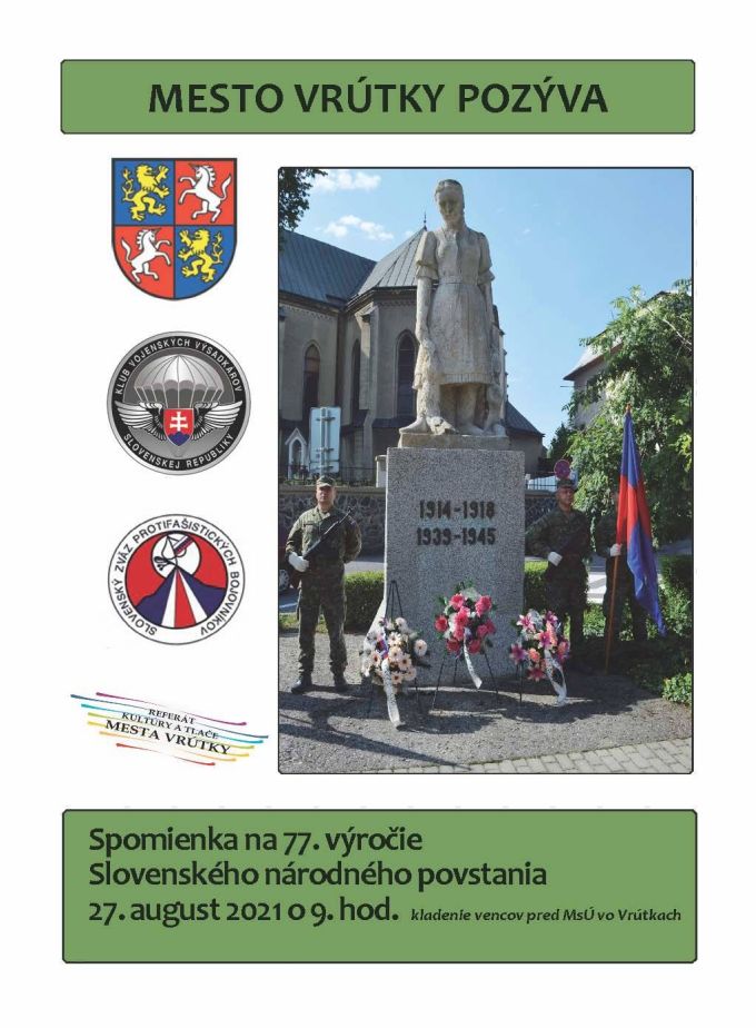 V piatok 27. augusta 2021 si pripomenieme 77. výročie Slovenského národného povstania o 09.00 hod. pri pomníku pred Mestským úradom vo Vrútkach.