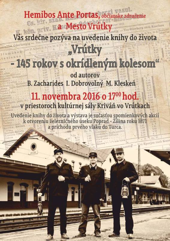 Mesto Vrútky a občianske združenie Hemibos Ante Portas Vás pozývajú na uvedenie knihy do života ”Vrútky - 145 rokov s okrídleným kolesom”. Viac informácií nájdete na priloženom plagáte.