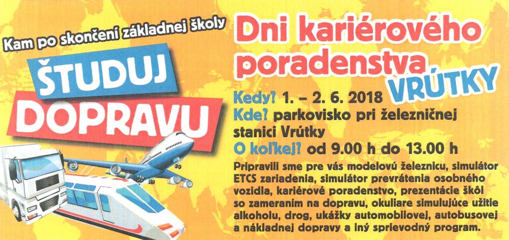7. Máj, 2018 | pridal adminV dňoch 1.-2. júna 2018 sa na parkovisku pri železničnej stanici Vrútky, v čase od 9.00 hod. do 13.00 hod., uskutoční podujatie Študuj dopravu. Bližšie informácie prinášame v priloženom plagáte.
