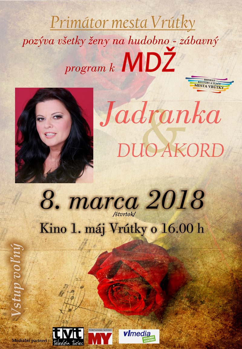 Pozývame všetky ženy na Hudobno - zábavný program pri príležitosti sviatku MDŽ, ktorý sa uskutoční v Kine 1. máj vo štvrtok 8. marca 2018 o 16:00 hod. Bližšie informácie prinášame v priloženom