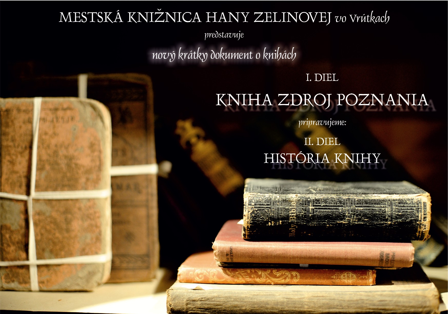Mestská knižnica Hany Zelinovej vo Vrútkach pre Vás pripravila dokument o knihách s názvom "KNIHA ZDROJ POZNANIA". Rezervácie priamo v knižnici, na tel. čísle: 043/4289 219 alebo mailom na: lahutova@vrutky.sk. Viac informácií nájdete v priloženom plagáte.