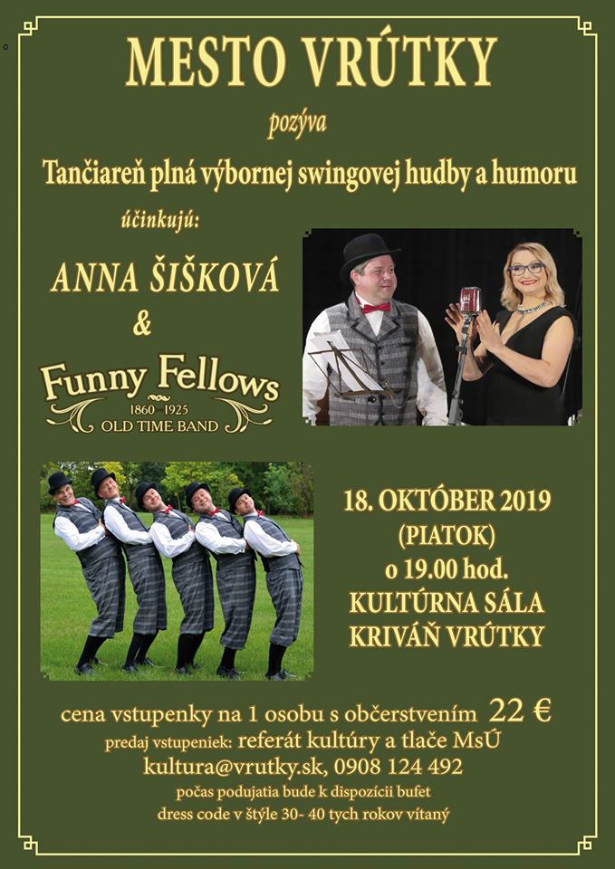Mesto Vrútky Vás dňa 18.10.2019 pozýva na swingovú tančiareň s kapelou Funny Fellows a Ankou Šiškovou. Viac informácií Vám prinášame v priloženom plagáte.