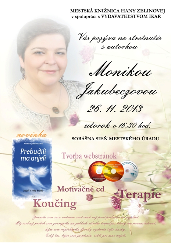 Mestská knižnica Hany Zelinovej v spolupráci s vydavateľstvom IKAR Vás pozýva na literárne stretnutie so slovenskou autorkou Monikou Jakubeczovou