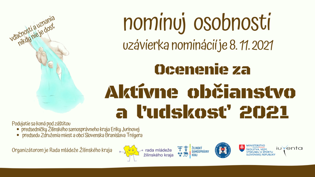 Rada mládeže Žilinského kraja ponúka v 6. ročníku obyvateľom kraja možnosť predložiť návrhy na udelenie ceny za aktívne občianstvo a ľudskosť. Cena bude udeľovaná v 5 kategóriách: Aktívny mládežník, Aktívny občan, Top starosta/primátor, Obec s najpriateľskejším vzťahom k mládeži a Top čin ľudskosti. Viac informácií si môžete pozrieť v priložených prílohách: tlačovej správe, štatúte a plagáte. Nominácie sa prijímajú do 08.11.2021 cez tento: odkaz.
