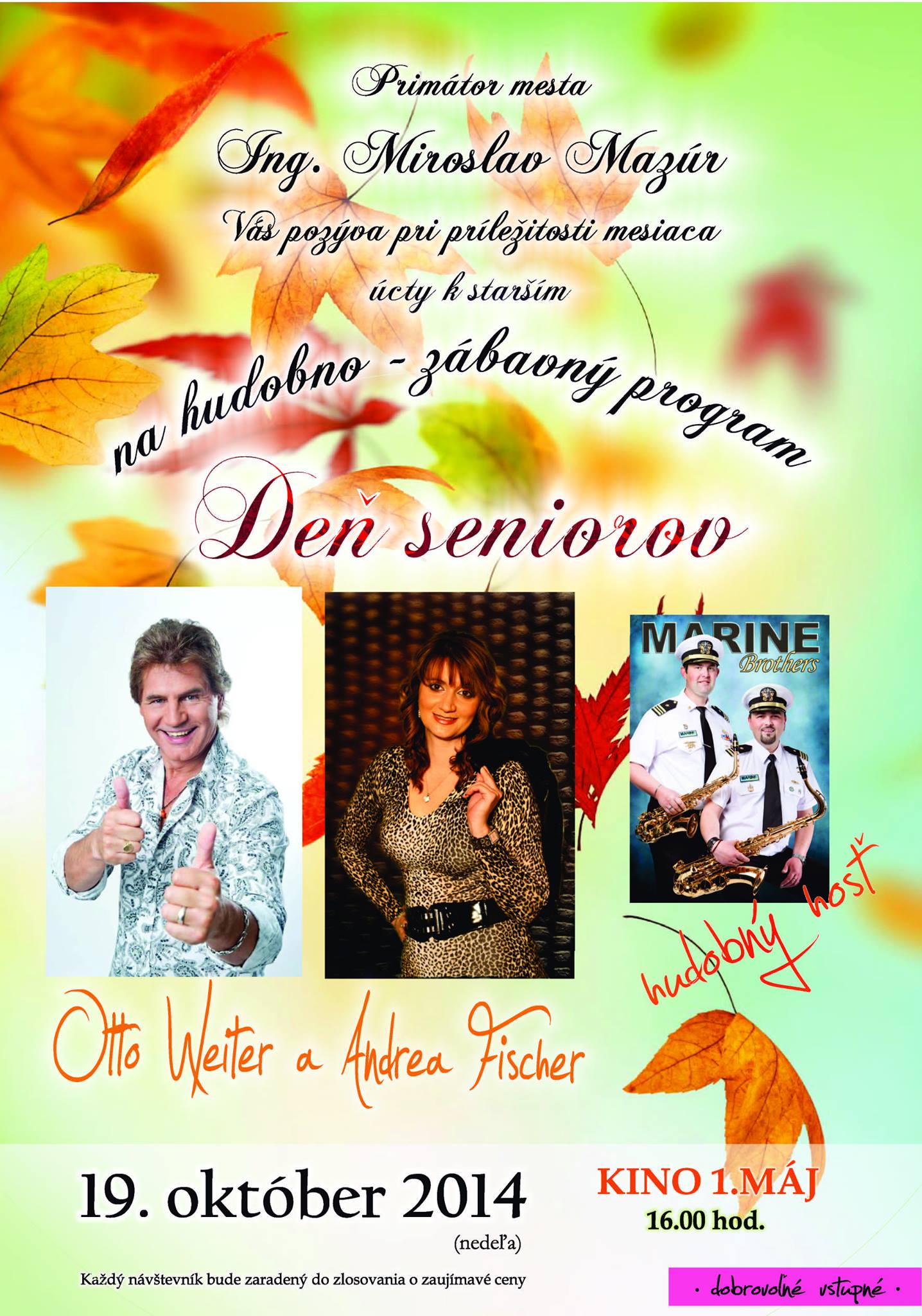 Primátor mesta Ing. Miroslav Mazúr Vás pozýva pri príležitosti mesiaca úcty k starším na hudobno-zábavné podujatie Deň seniorov dňa 19. októbra 2014 (nedeľa) o 16.00 hod. v Kine 1. máj.
