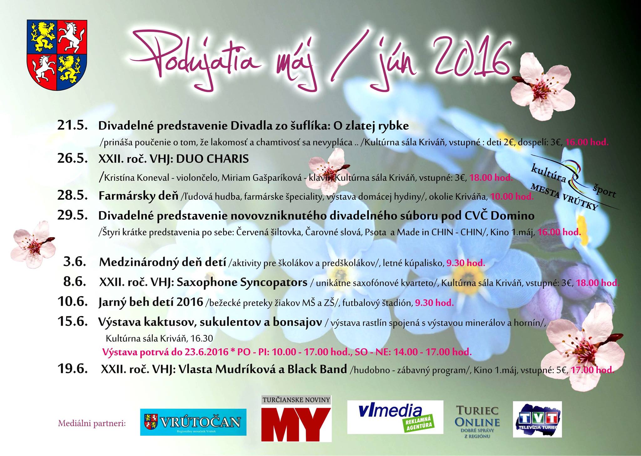 12. Máj, 2016 | pridal kulturaKultúrne podujatia v mesiaci máj/jún organizované Mestom Vrútky si môžete prečítať v priloženom plagáte.