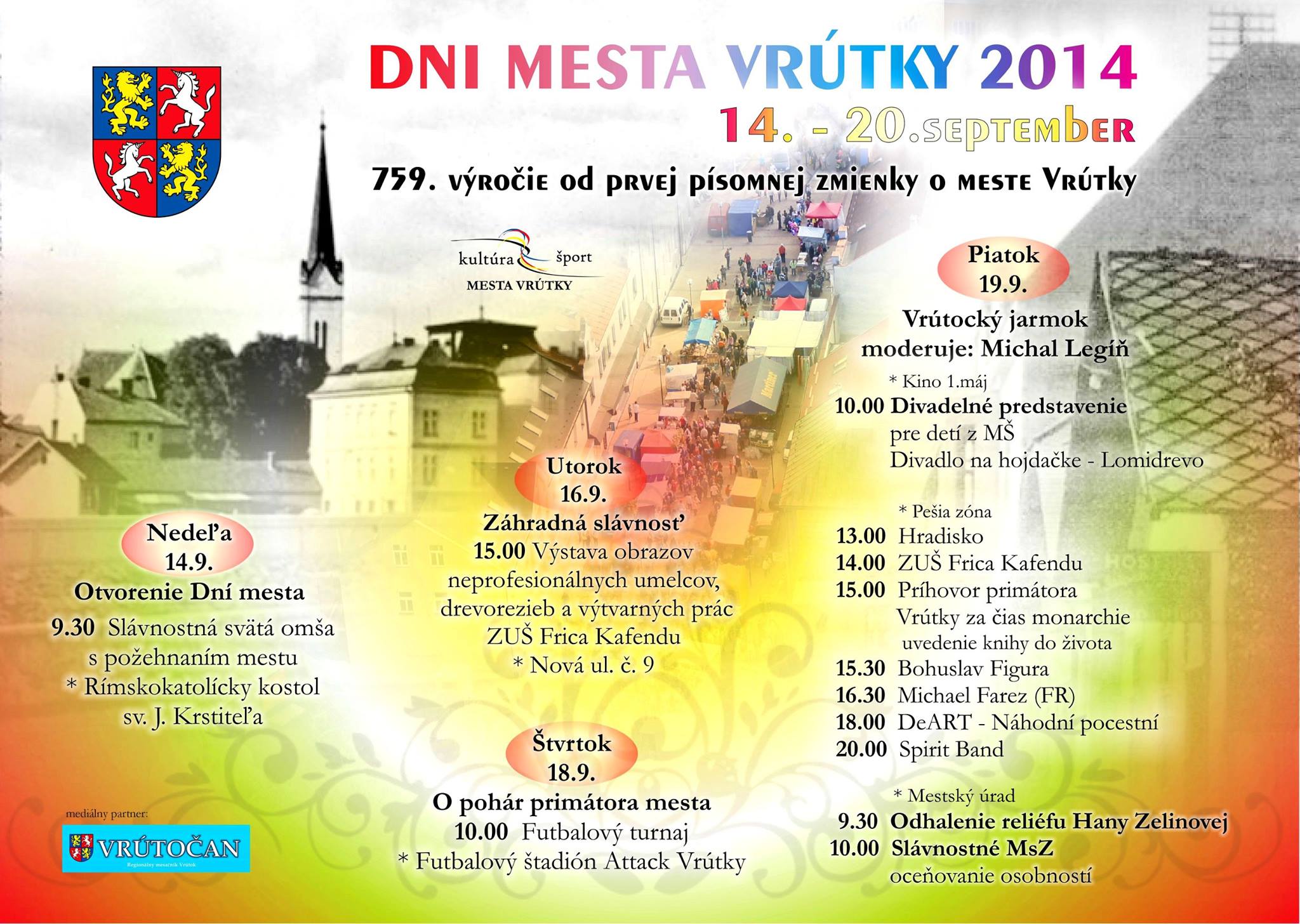 Tento rok si pripomíname 759. výročie prvej písomnej zmienky o meste Vrútky, pripravujeme slávnostnú svätú omšu s požehnaním Mestu Vrútky, odhalenie reliéfu Hany Zelinovej, uvedenie novej vrútockej publikácie o historických Vrútkach, koncerty, rôzne výstavy, ako aj futbalový turnaj.