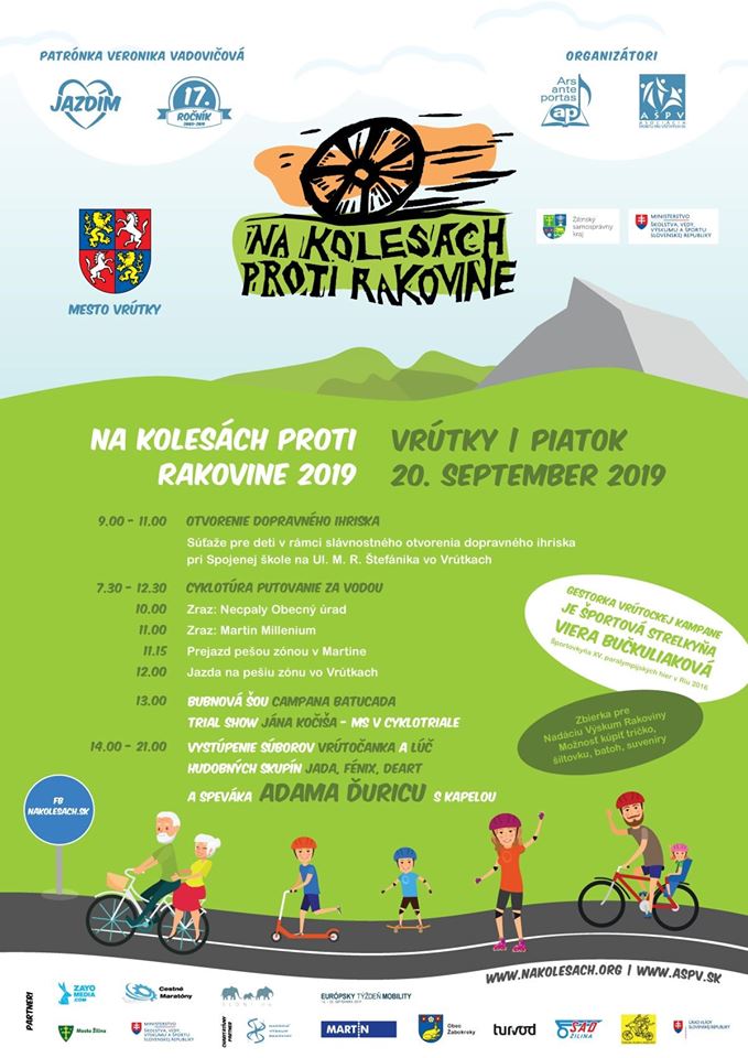 Príďte podporiť aj vy charitatívnu akciu "Na kolesách proti rakovine" v rámci Európskeho týždňa mobility na pomoc onkologickým pacientom. Akcia je zameraná na šírenie osvety o výskume, prevencii a liečbe rakoviny. Verejná zbierka pre Nadáciu Výskum rakoviny sa uskutoční 20. septembra na pešej zóne vo Vrútkach v čase od 9 - 20 hod. Stačí si prinesť bicykel, kolobežku, odrážadlo, čokoľvek bezmotorové s kolesami a spoločne roztočíme kolesá v boji proti rakovine. Viac informácií si môžete prečítať v plagáte.