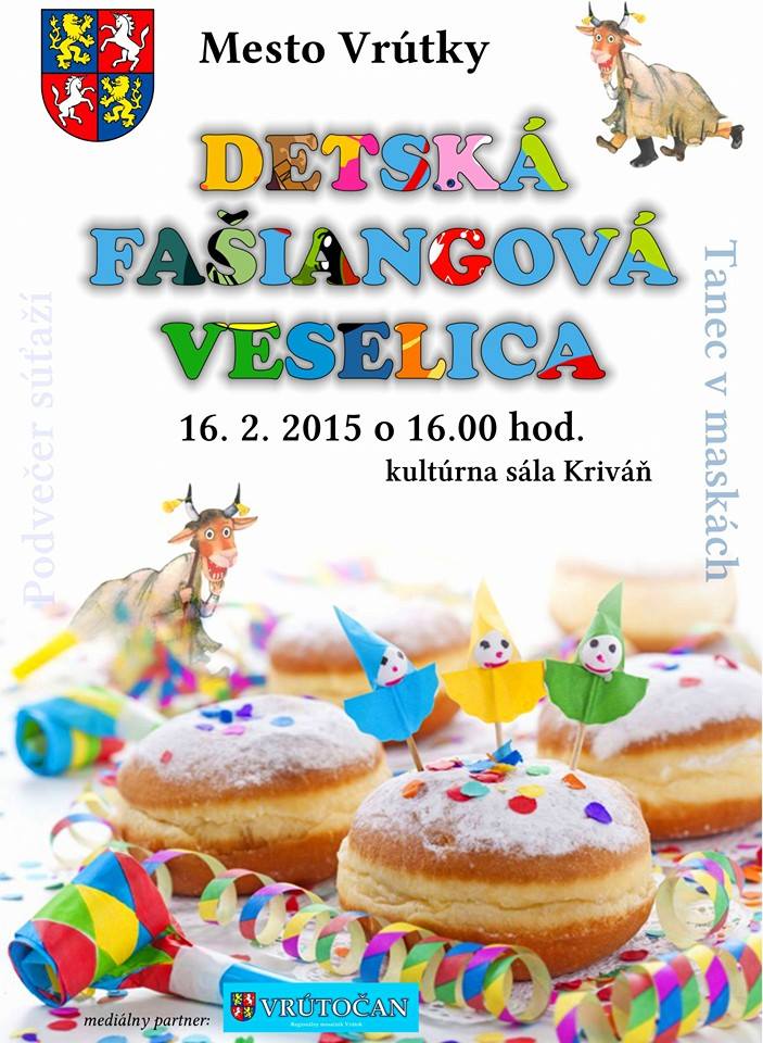 Mesto Vrútky Vás pozýva na podujatie Detská fašiangová veselica dňa 16. februára (pondelok) od 16.00 hod. do kultúrnej sály Kriváň.