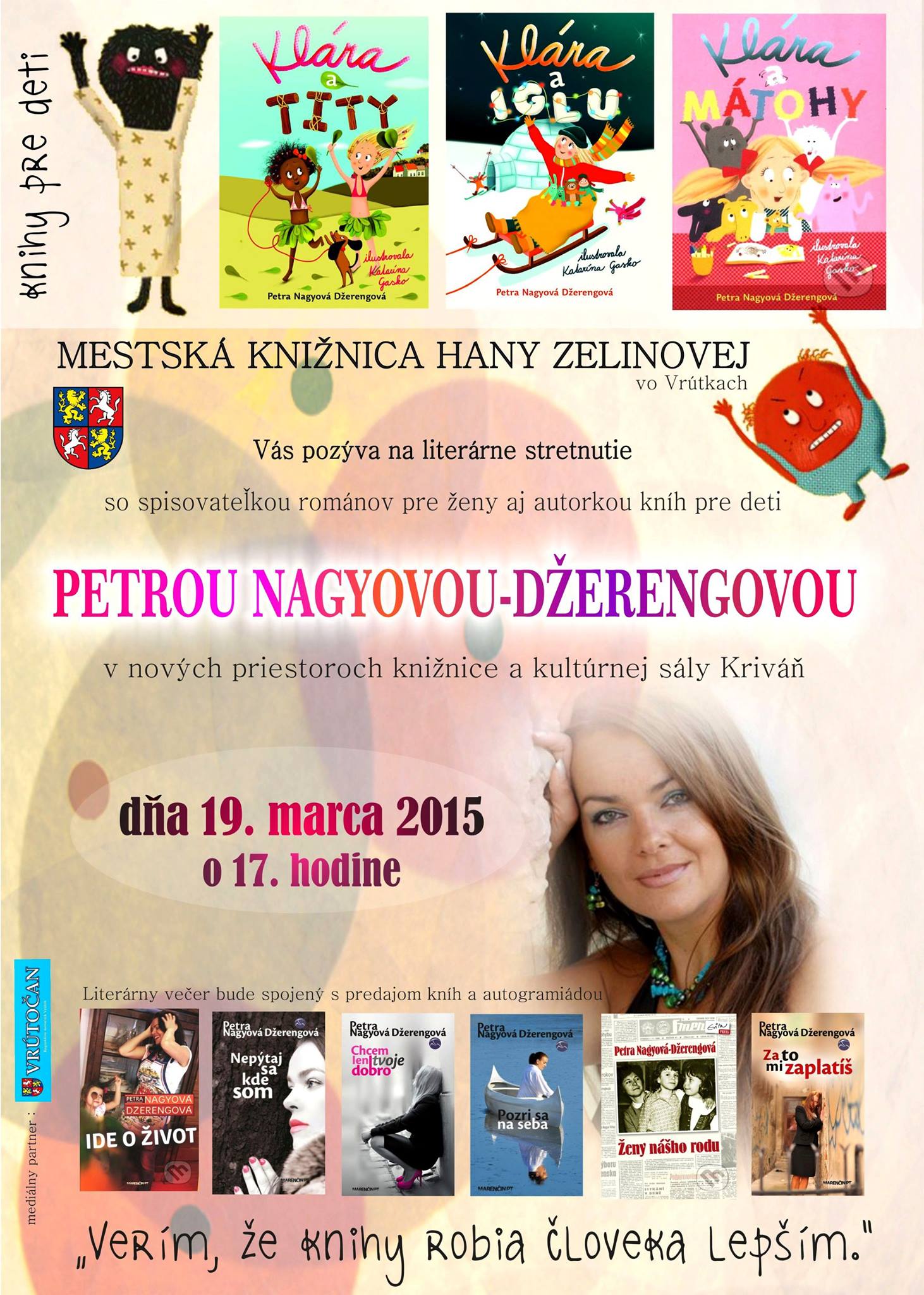Mestská knižnica Hany Zelinovej Vás pozýva na literárne stretnutie so slovenskou autorkou Petrou Nagyovou-Džerengovou dňa 19. marca 2015 (štvrtok)
