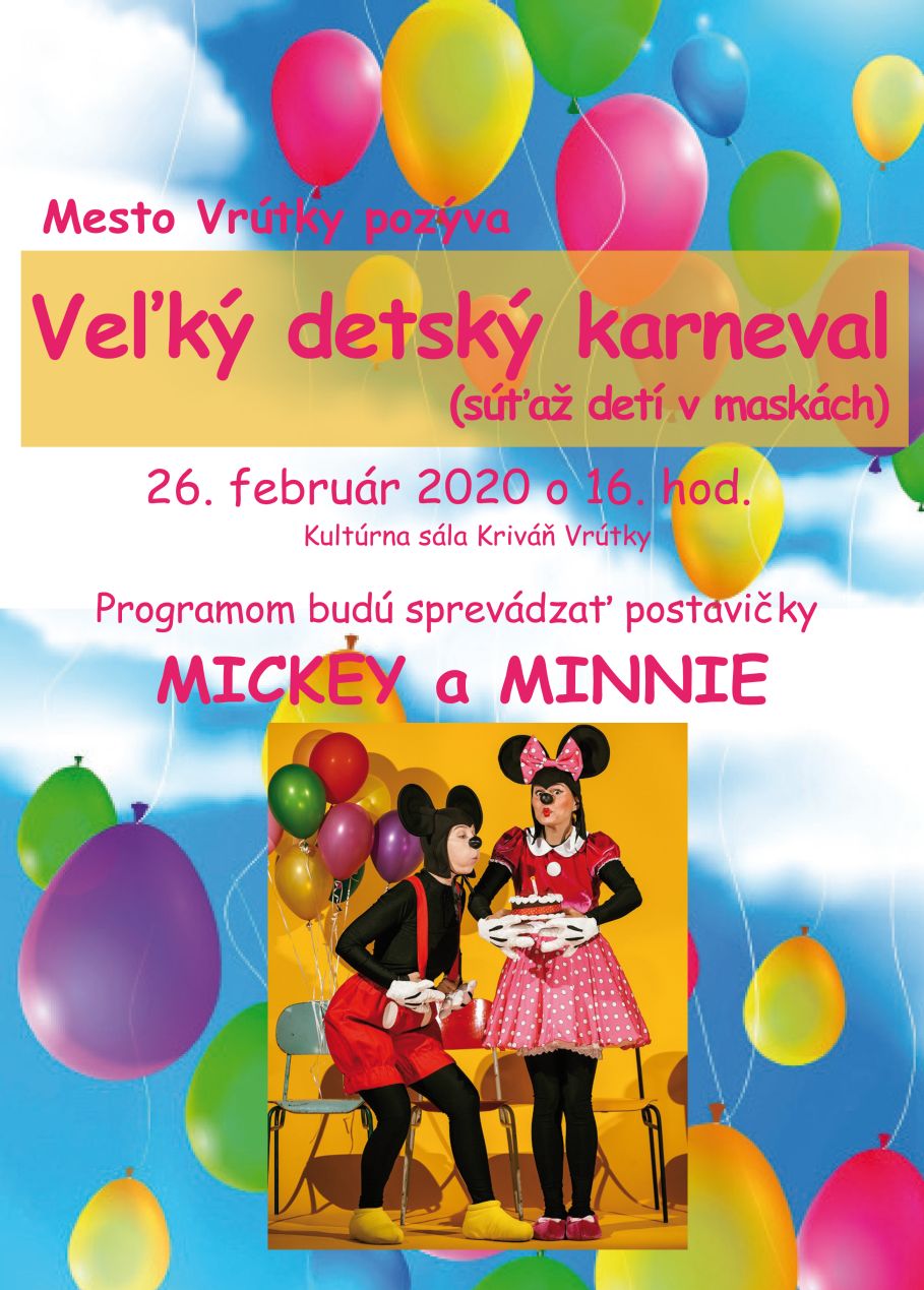 18. Február, 2020 | pridal adminMesto Vrútky, dňa 26. februára 2020 o 16. hod., pozýva všetky deti v maskách na karneval do Kriváňa. O zábavu sa postarajú postavičky Mickey a Minnie. Viac informácií si môžete prečítať na priloženom plagáte.