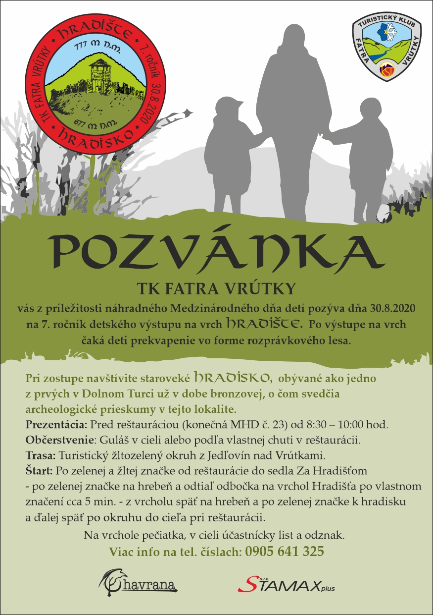 18. August, 2020 | pridal adminTK Fatra Vrútky Vás z príležitosti náhradného Medzinárodného dňa detí pozýva dňa 30.8.2020 na 7.ročník detského výstupu na vrch Hradište. Po výstupe na vrch čaká deti prekvapenie vo forme rozprávkového lesa. Viac informácií si môžete pozrieť na priloženom plagáte.