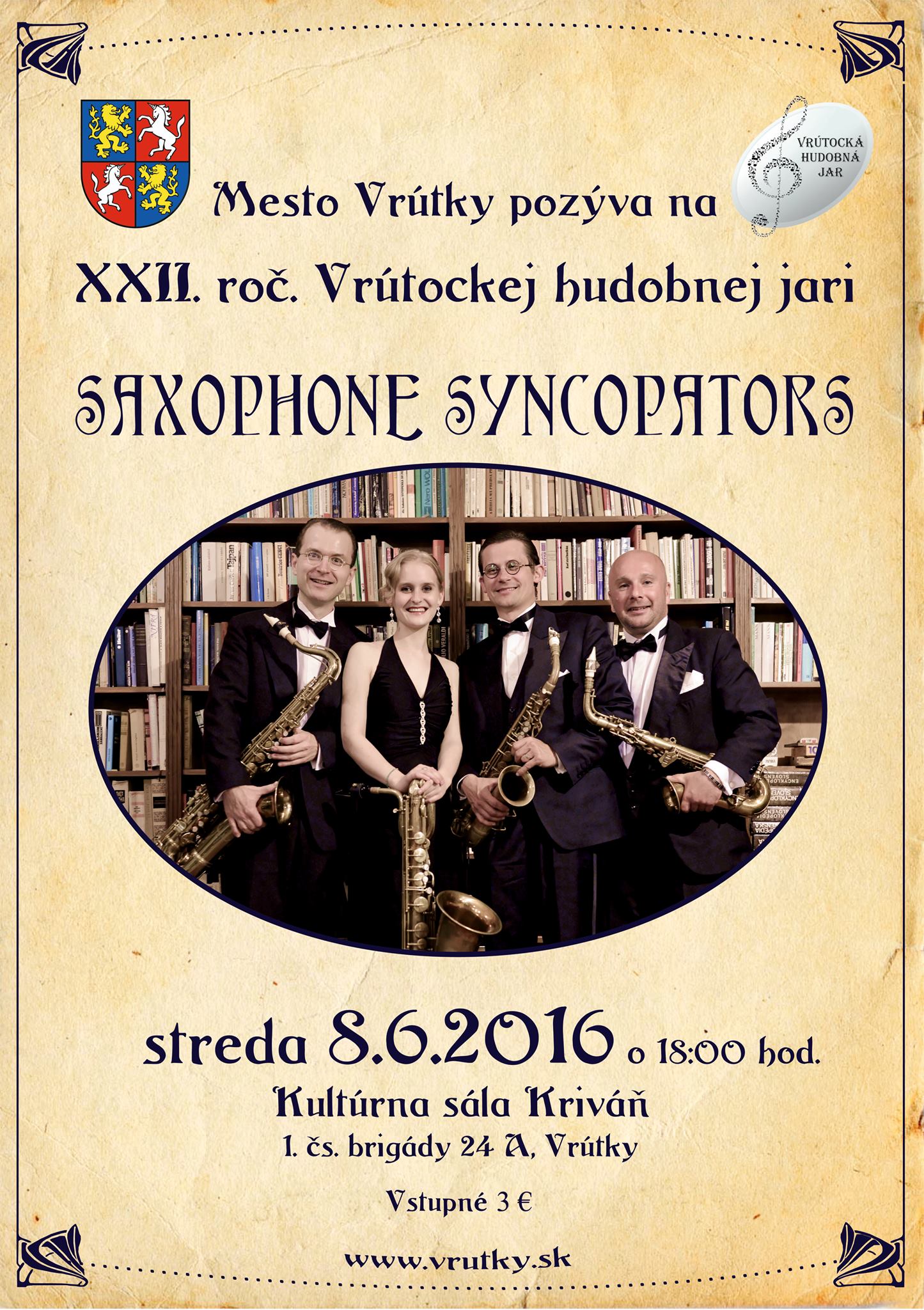 Mesto Vrútky Vás v rámci XXII. ročníka VHJ pozýva na koncert unikátneho saxofónového kvarteta Saxophone Syncopators, ktorý sa uskutoční v stredu 8. júna 2016 o 18:00 v kultúrnej sále Kriváň.