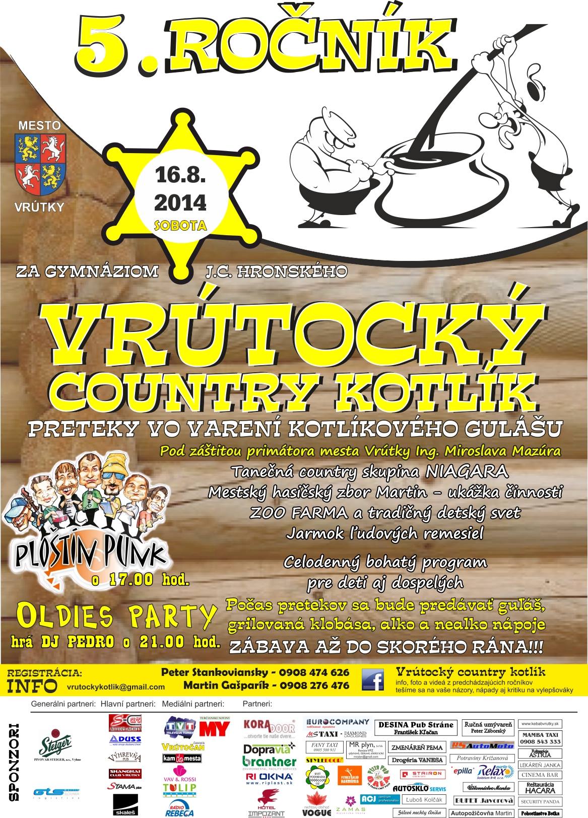 Mesto Vrútky Vás pozýva na preteky vo varení kotlíkového gulášu. 5. ročník Vrútockého country kotlíka sa bude konať dňa 16. augusta 2014. Pripravený bude bohatý program pre deti aj dospelých.