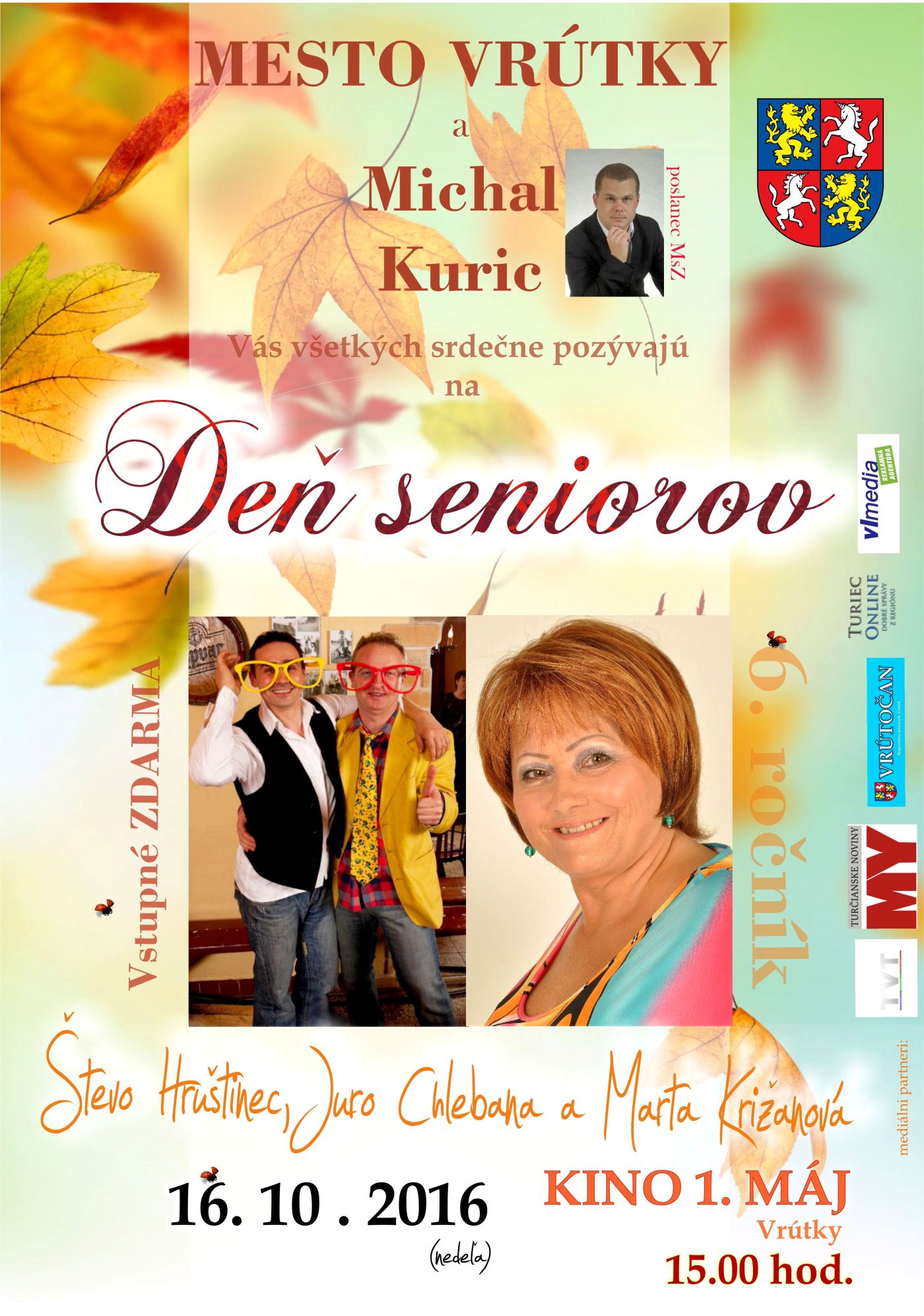 4. Október, 2016 | pridal adminMesto Vrútky v spolupráci s poslancom MsZ Michalom Kuricom Vás pozývajú na koncert v rámci mesiaca úcty k starším.