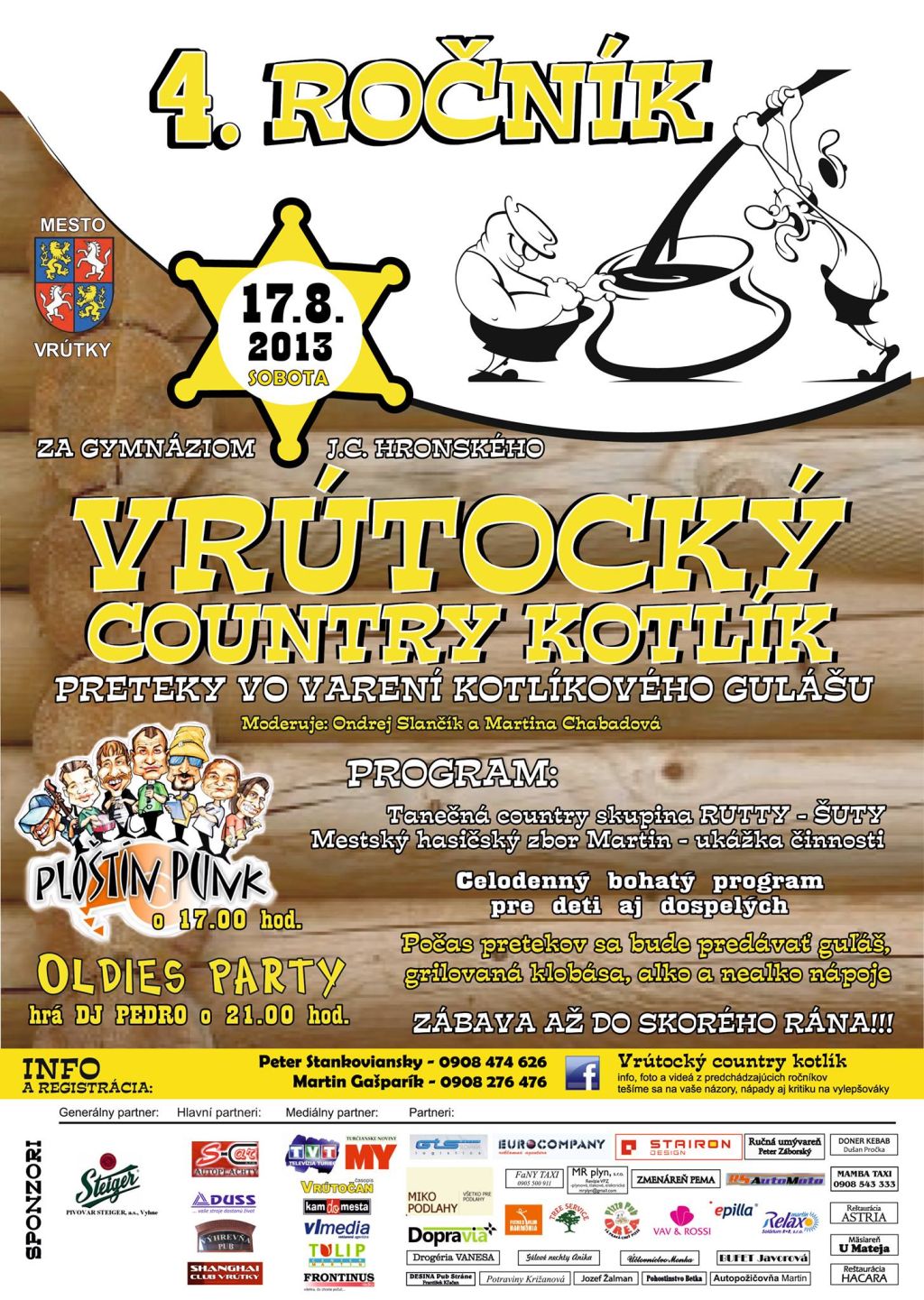 Mesto Vrútky Vás pozýva na preteky vo varení kotlíkového gulášu. 4. ročník Vrútockého country kotlíka sa bude konať dňa 17. augusta 2013. Pripravený bude bohatý program pre deti aj dospelých.